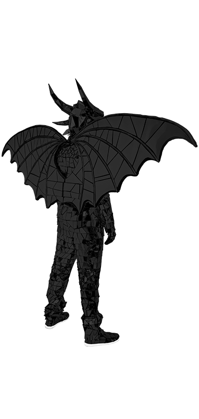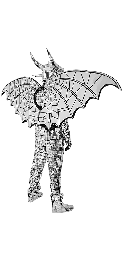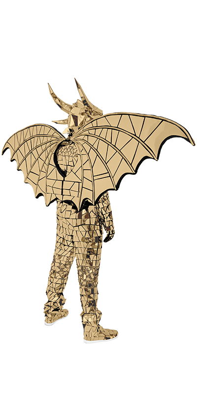 Впечатляющий дизайн: Костюм полностью покрыт зеркальными элементами, которые отражают свет и создают потрясающий визуальный эффект. Драконьи детали добавляют костюму мощи и мистики.