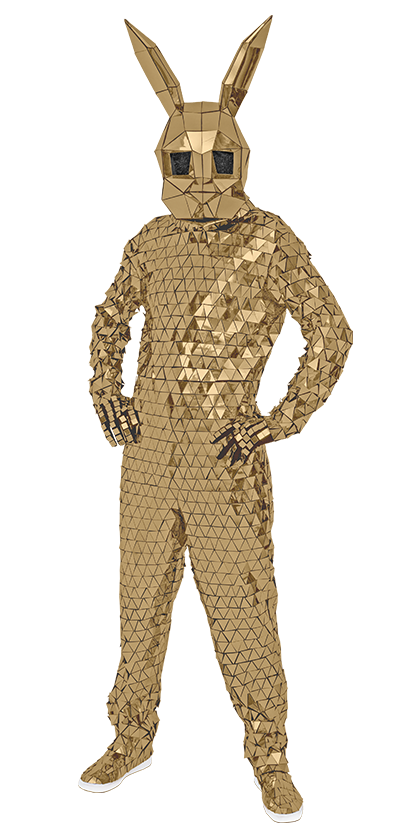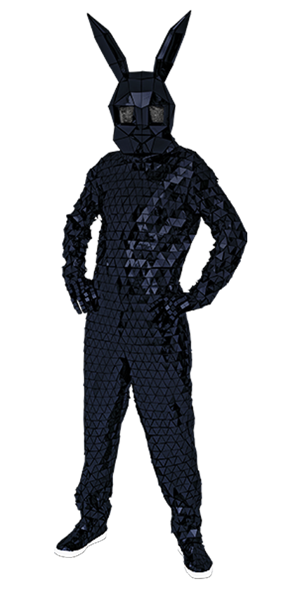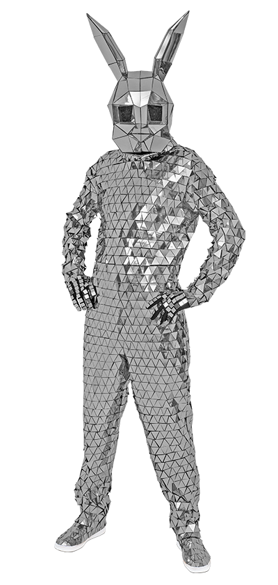 Очаровательный дизайн: Комбинезон полностью покрыт зеркальными элементами, которые отражают свет и создают потрясающий визуальный эффект. Образ кролика добавляет костюму игривости и очарования.